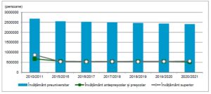 Din baza de date a Institutului Național de Statistică reiese că populația școlară este în scădere, aceasta fiind una dintre consecințele sporului natural negativ care se înregistrează în ultimii douăzeci de ani în România. În anul universitar 2020-2021 doar 16% din populația școlară erau studenții din învăţământul superior (Fig. 1).