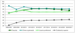 Participarea la educația formală în învăţământul superior aproape s-a dublat în perioada 2000 – 2020, ajungând la un procent de 42,8% din totalul populației școlare în anul universitar 2020/2021 (Fig. 2).